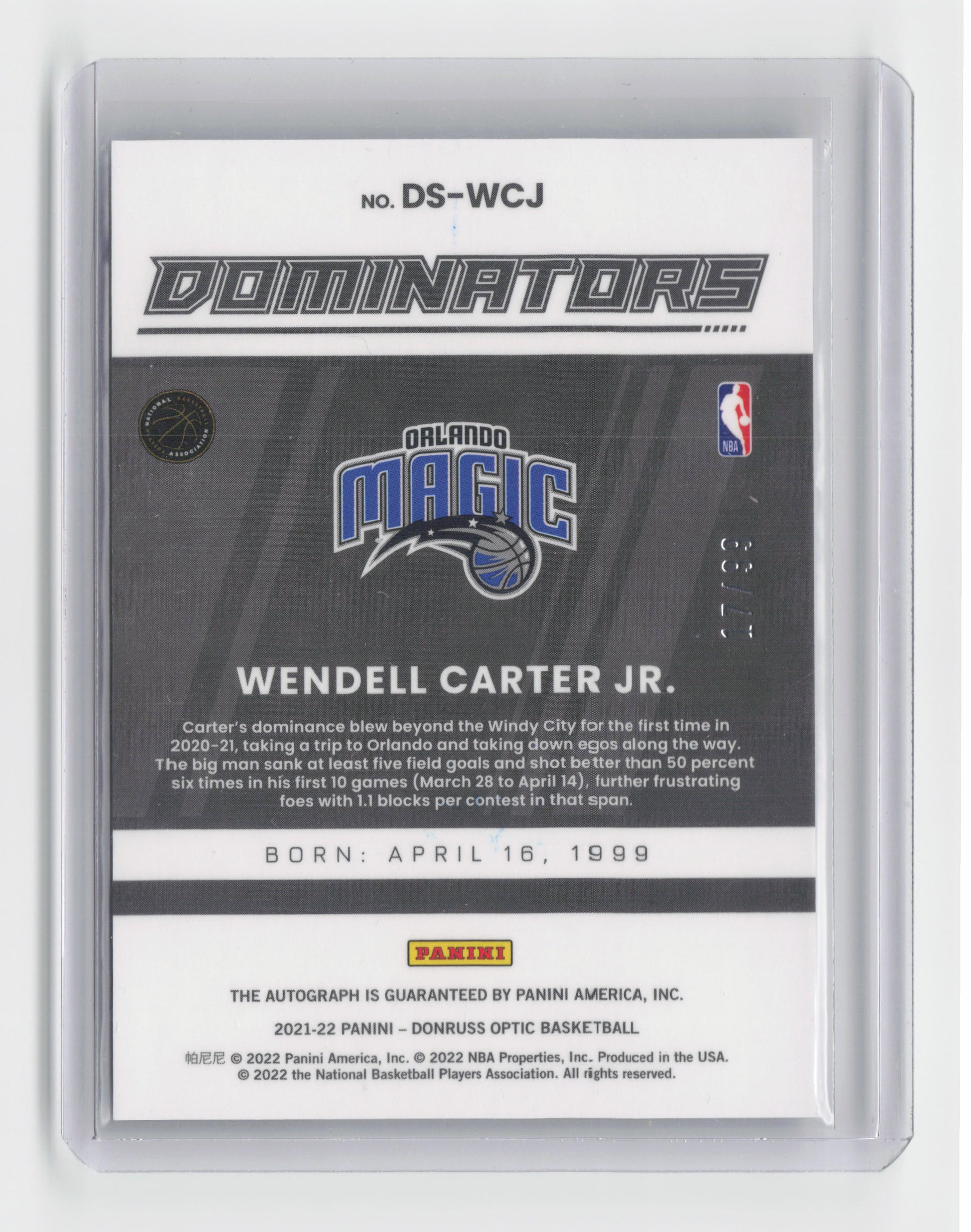 2021-22 - WENDELL CARTER JR. - Dominators Autograph 17/99 - Optic - Magic